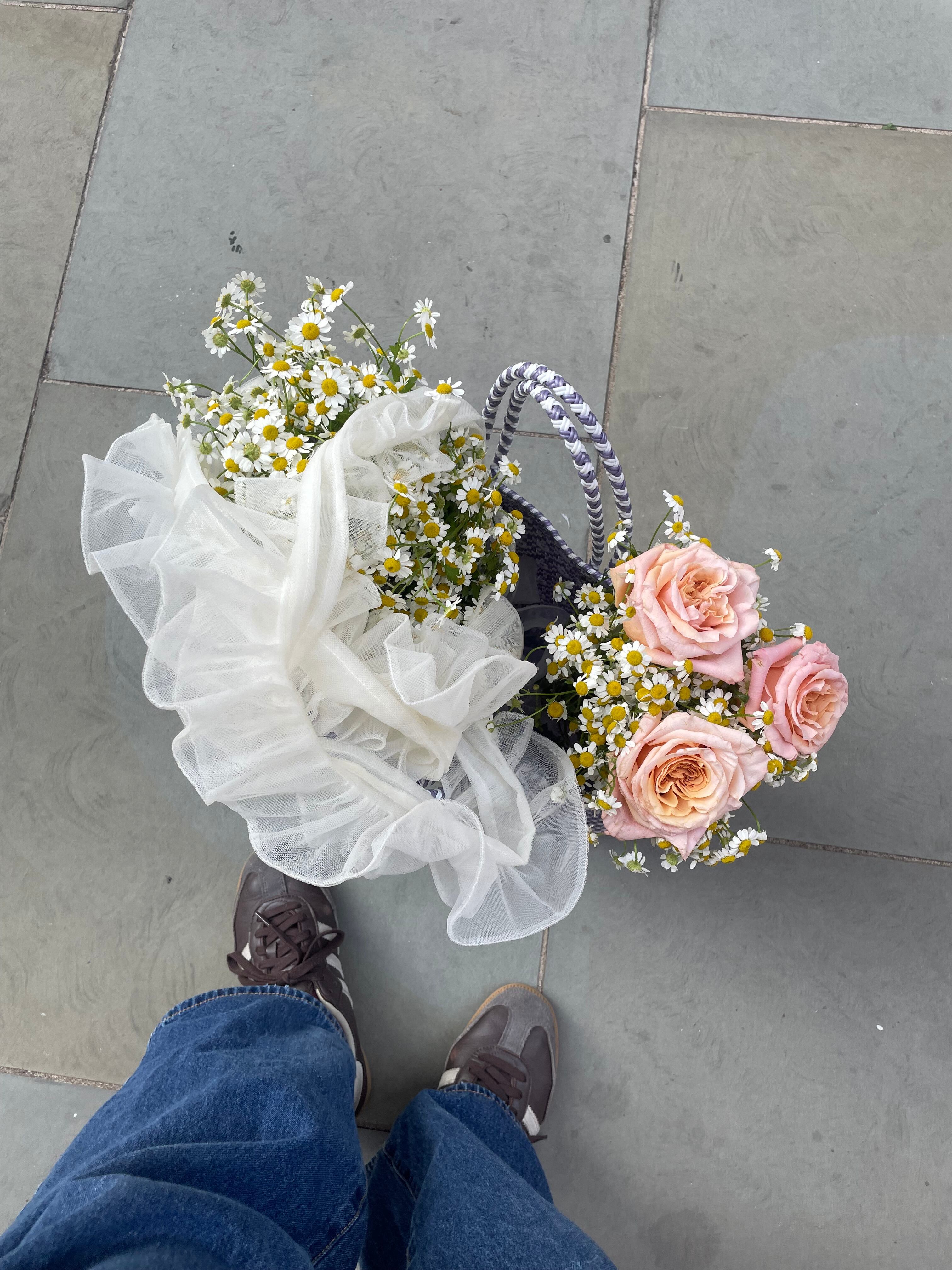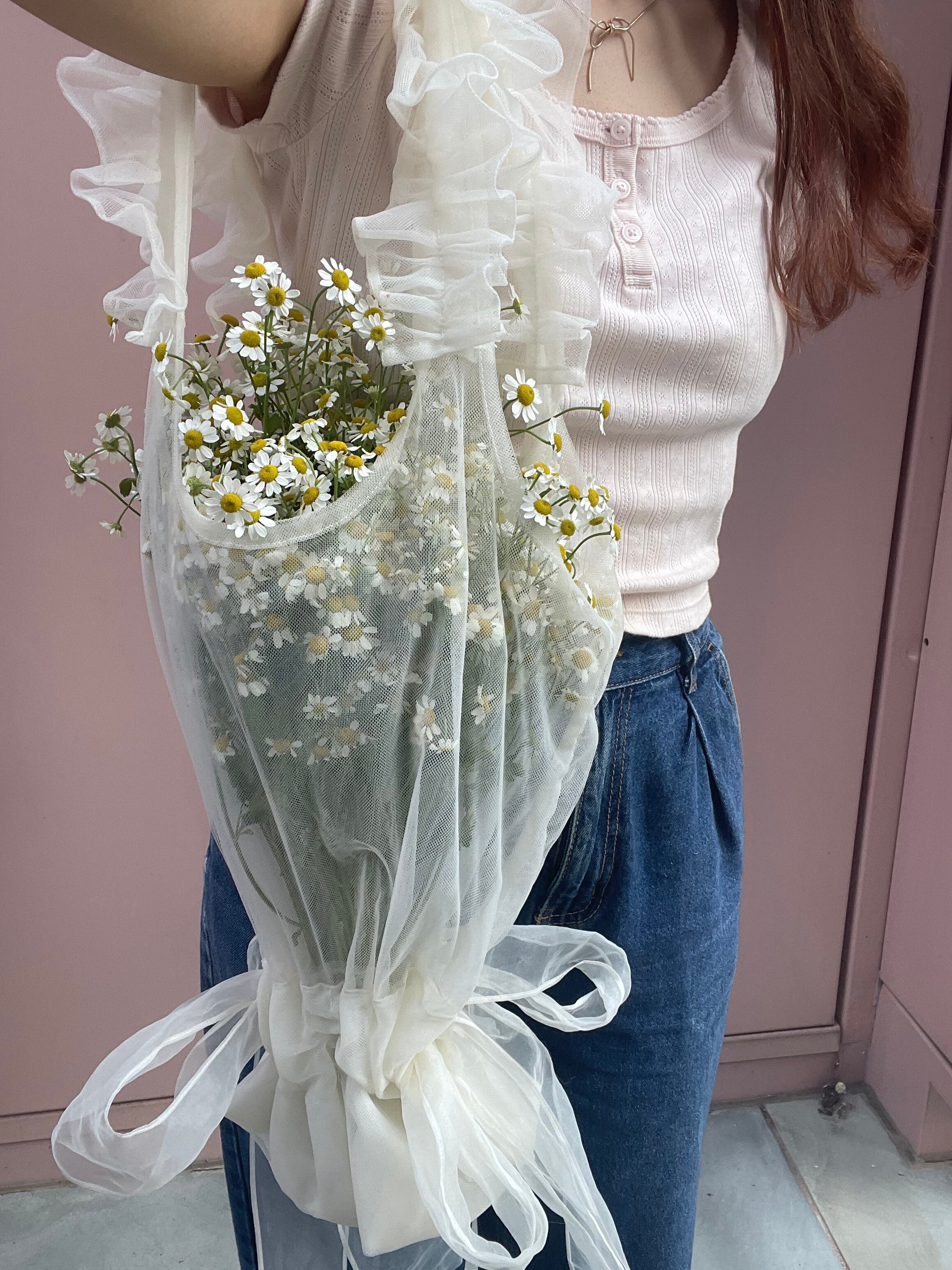 持ち手と底はオーガンジーとチュールの二重構造で、見た目の華やかさと強度を両立。