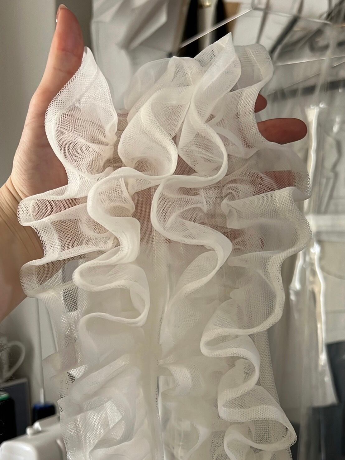 裁断から縫製、フリルバランスの調整まですべて手掛けています。