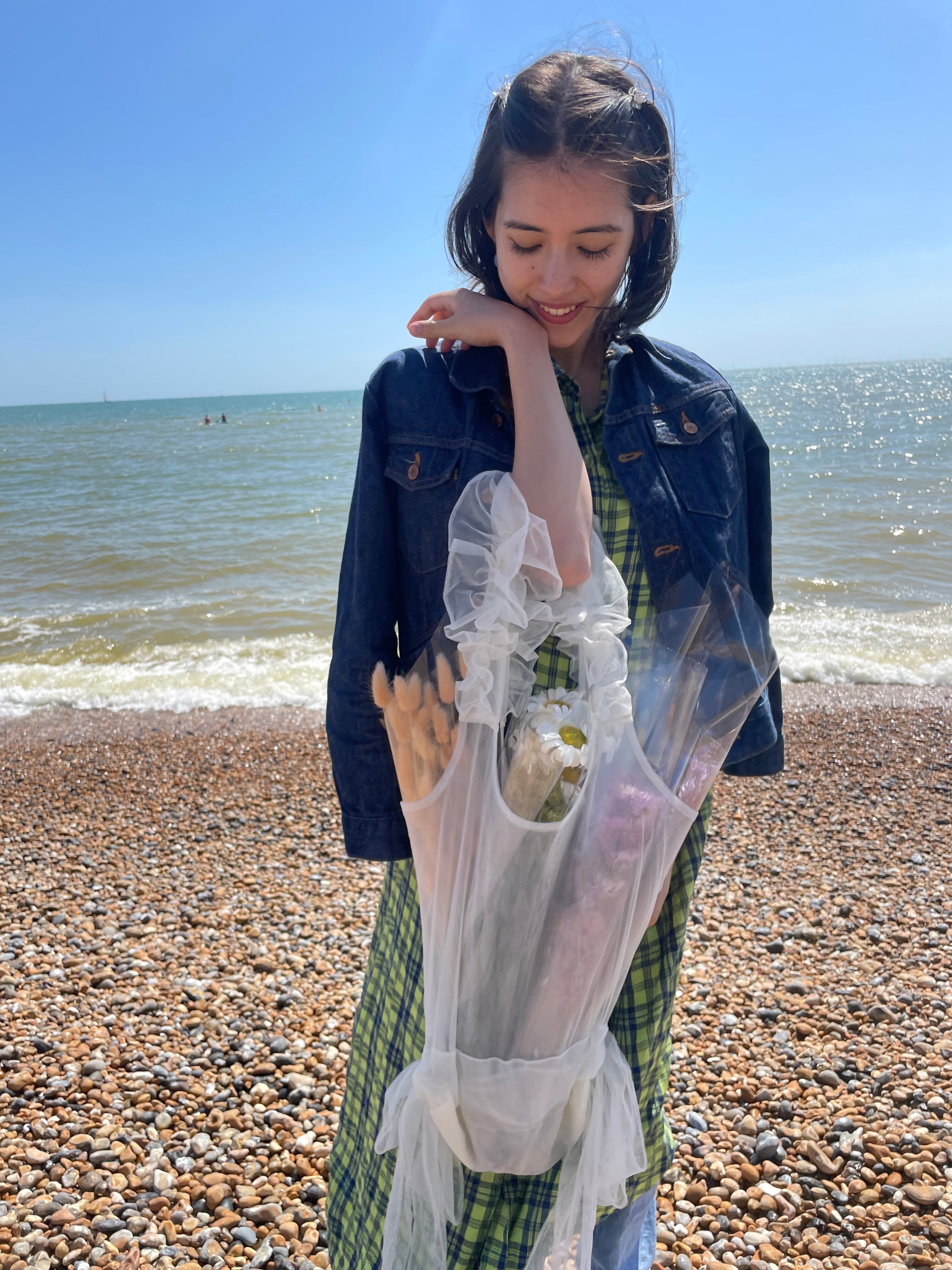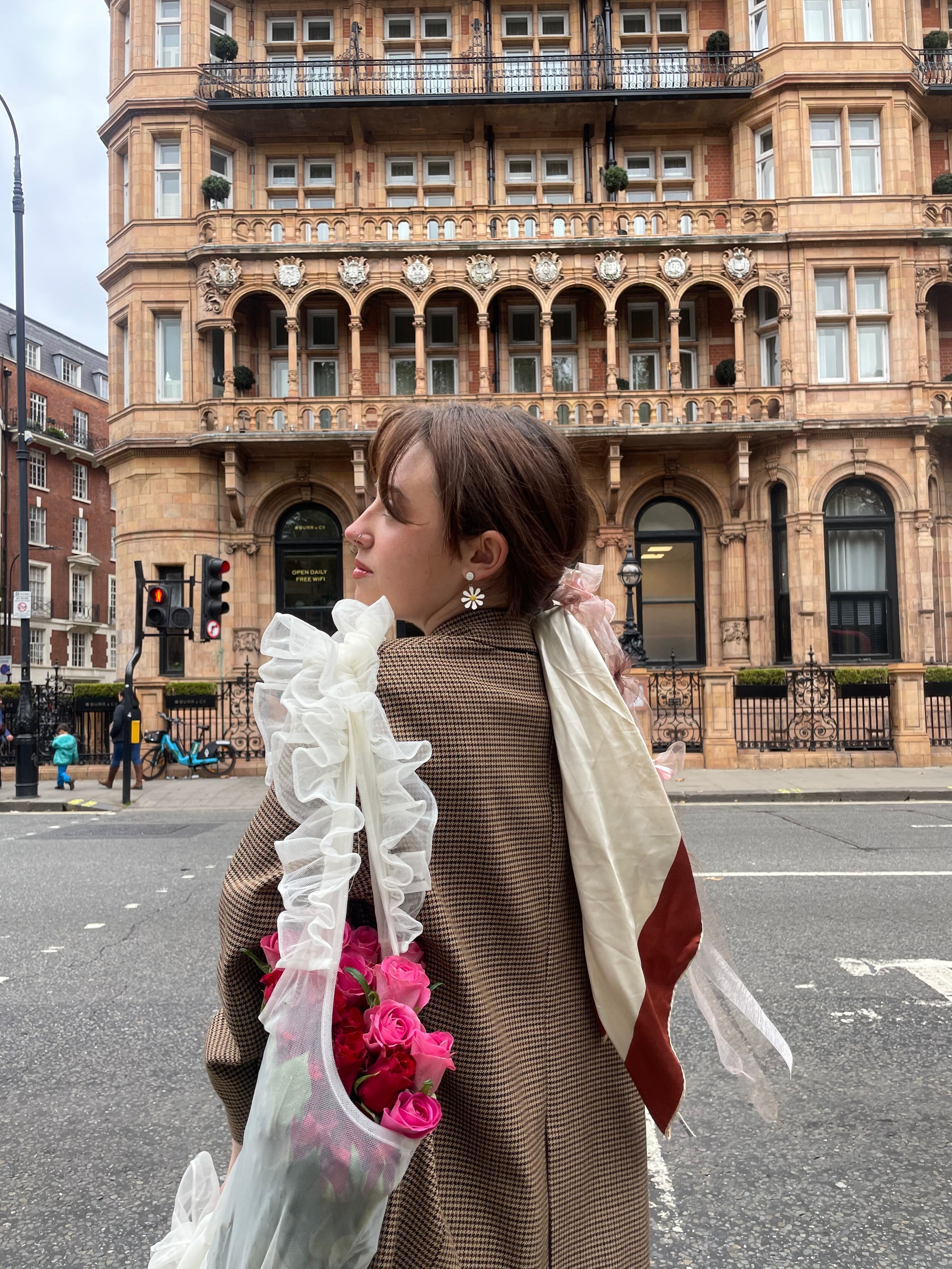 持ち手と底はオーガンジーとチュールの二重構造で、見た目の華やかさと強度を両立。