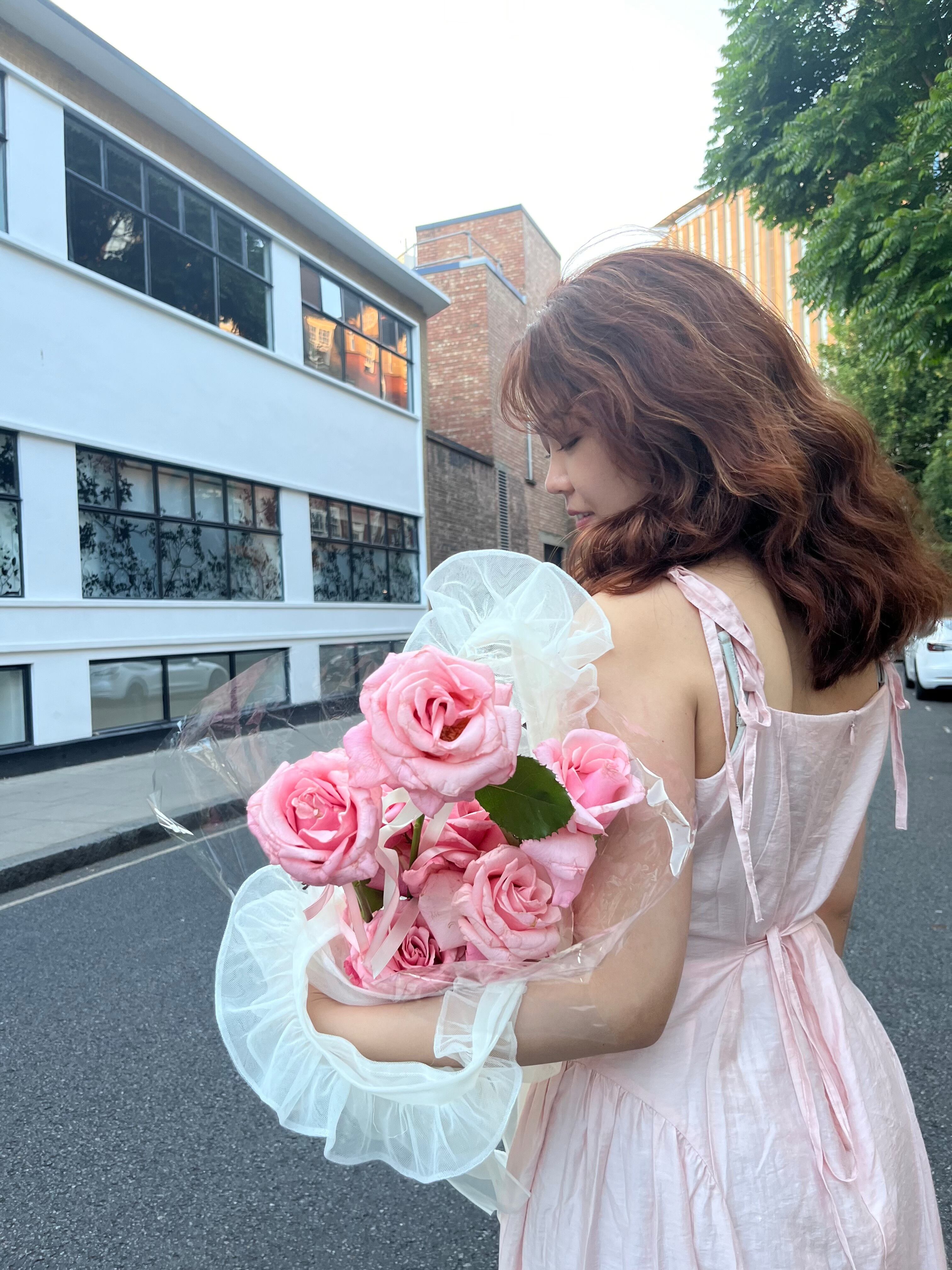 本体をややすぼめ、裾をリボンで結ぶことで「ブーケを包むラッピング」を再現。